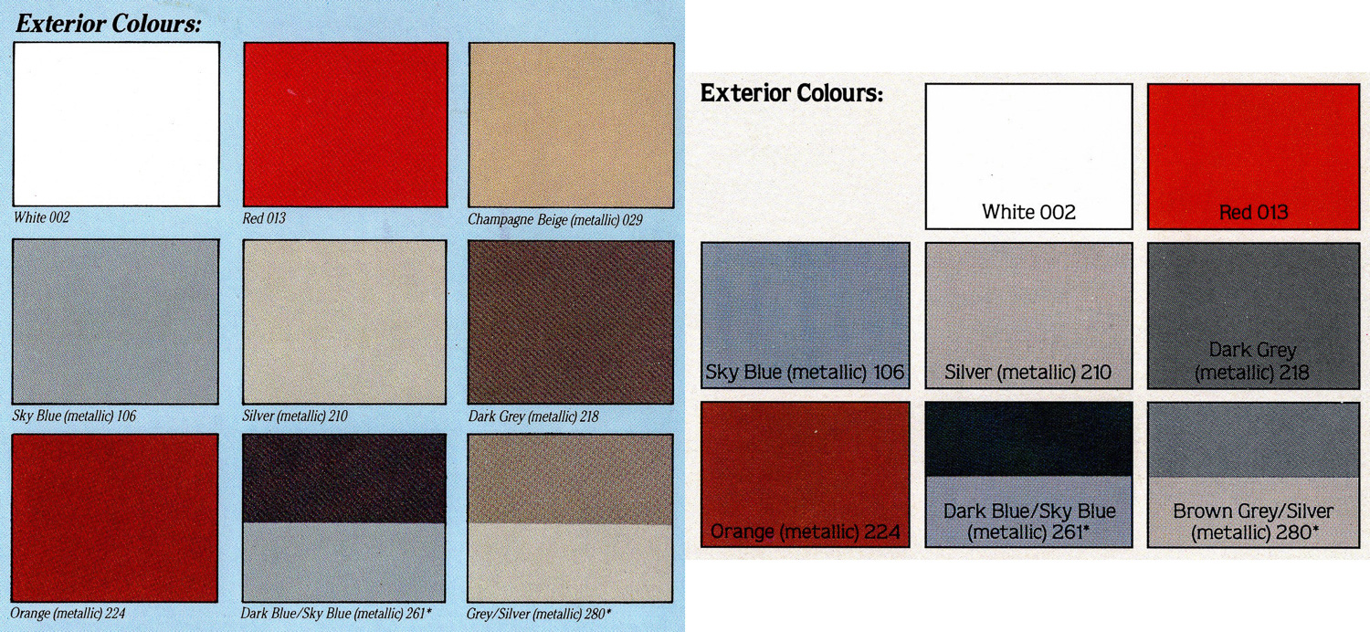 Left, colour options Oct. 1983 - Mar. 1985 | Right, colour options Mar. 1985 - Oct. 1986