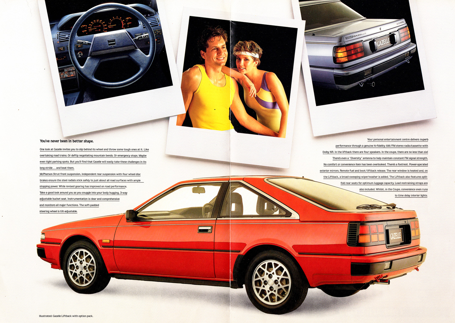 It also offers most of the creature comforts of the Coupe, at a lower price. There's a 4-speaker electronic AM/FM stereo radio/cassette player with Dolby noise reduction for your listening enjoyment. Remote control fuel lid and liftback release for convenience. Luxury cloth trim and cutpile carpet throughout for comfort. Instrumentation includes tachometer, low-fuel/door ajar lamps and digital clock. The rear window is heated and has a wiper/washer. The split-fold rear seat can be used with one side down, or both. And luggage retaining straps are included to keep everything secure. All this, and more, is standard. In fact, the only optional extras available are the 4-speed automatic transmission and special options pack consisting of air conditioning, sunroof and alloy wheels. Nissan Gazelle Australia Brochure